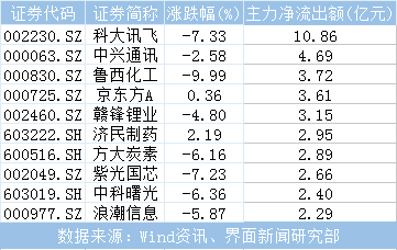 科大讯飞(002230.SZ)、中兴通讯(000063.SZ)、鲁西化工(000830.SZ)占据主力净流出个股前三,其净流出额分别为10.86亿元、4.69亿元、3.72亿元。而鲁西化工前一交易日录得股价新高,今日却一路受挫,以跌停收场。计算机、有色金属行业领跌两市,赣锋锂业(002460.SZ)、方大炭素(600516.SH)、中科曙光(603019.SH)、浪潮信息(000977.SZ)分别遭遇主力净流出3.15亿元、2.89亿元、2.40亿元、2.29亿元。此外,OLED概念热门股京东方A(000725.SZ)主力净流出额为3.61亿元。