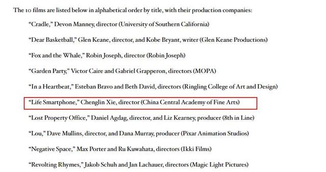 在经过进一步的审核,奥斯卡从提交申请的63部动画短片作品中,选出了十部有资格角逐最终五个提名的动画短片,其中包括了一部中国动画短片。
