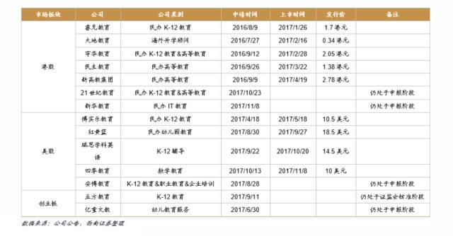 观察近期IPO或处于申报阶段的教育标的,可以发现明显的板块分化:K12课外培训和幼教集团多倾向于美股上市;民办K12&高等教育集团由于无法A股IPO多集中于港股。