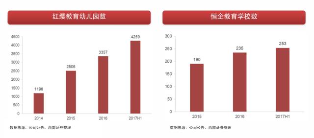 社会资本助力下,教育公司开始大举异地扩张。以威创股份和开元股份为例,威创股份旗下的红缨教育幼儿园数量从2014年1198所增长至4259所,开元股份旗下恒企教育学校数由2015年190所增长至253所。