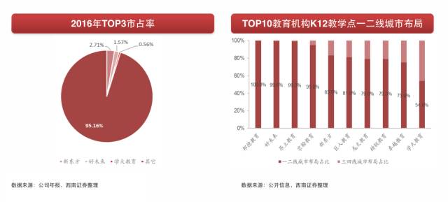 K12课外培训市场集中度较低,新东方、好未来、学大教育等三大巨头市占率综合不到5%。