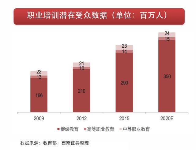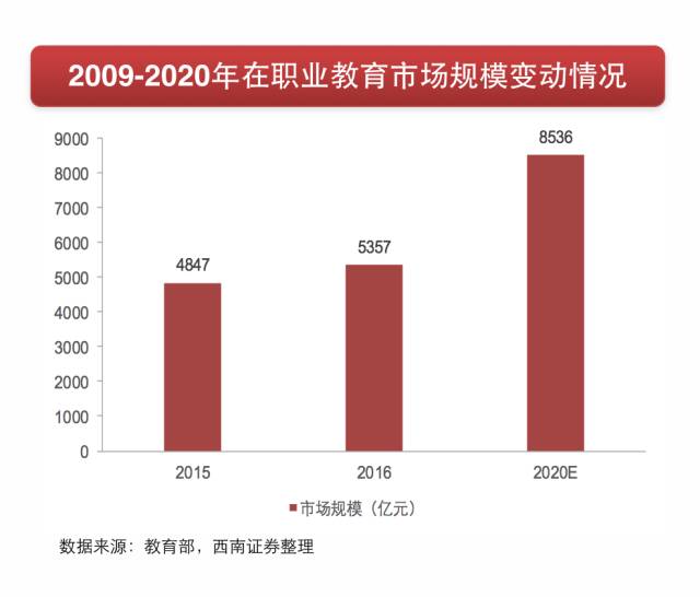 职业教育由中等职业教育、高等职业教育和继续教育三部分构成。根据国家发展纲要要求,2020年职业培训市场规模有望达到8536亿元,上探万亿规模亦有可能。从政策、业绩角度分析,我们认为职业教育是A股最有可能产生板块效应的细分领域。
