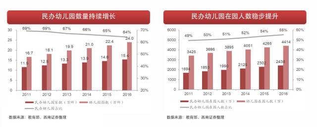 民办幼儿园是幼教领域的主流,民办幼儿园数量占比始终高于60%,在园人数稳步提升,2016年比重约55%。