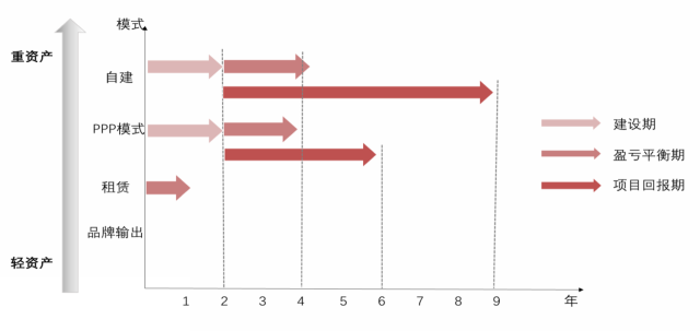 现有教育产业运营模式主要四种,分别是品牌输出模式、租赁模式、PPP模式和自建模式。品牌输出和租赁模式无需建设期,可较快实现盈利;PPP和自建模式则需2年建设期,且盈亏平衡期基本都在2年左右,重资产模式稍长。由于前期投入较大,重资产模式需7年时间收回成本,轻资产则为4年。