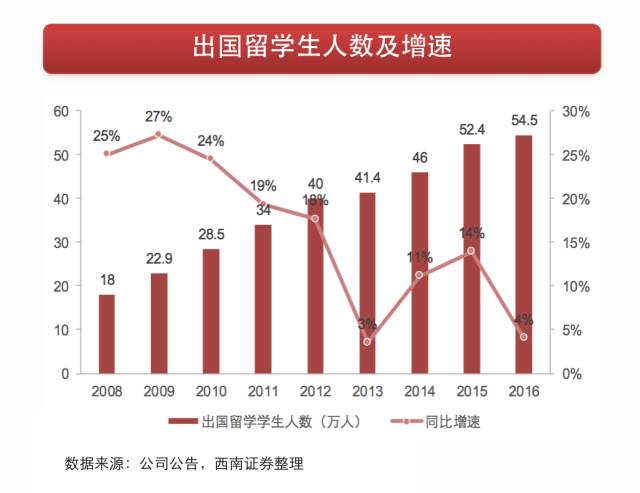 我国出国留学生人数从2008年18万人增长至2016年54.5万人,年均增速15%。近几年留学生增速明显放缓,但整体稳中有升。