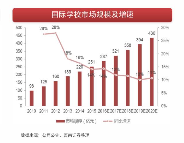 2010-2016年国际学校数量逐年增加,尤其是民办国际学校,从2010年84所增长至2016年392所,年均复合增速高达29%。IEduChina报告数据显示,国际学校市场规模由2010年98亿元增至2015年251亿元。预计未来几年国际学校市场规模将以10%以上的增速增长,2020年估计可达436亿元。