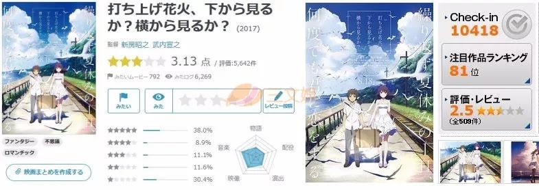 日本市场,《烟花》上映首日收入1亿7000万日元,观影13万3000人。由于对标《你的名字》,人们熙攘喧闹,“票房要破40亿!”“50亿才对!”“60亿!!”。