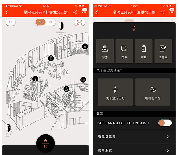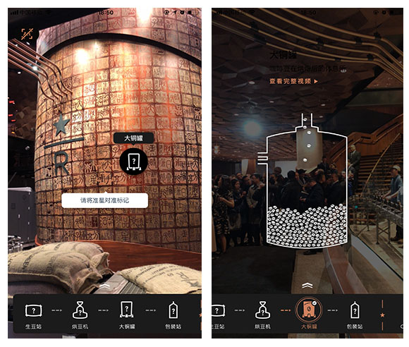 更重要的是,这家门店是星巴克第一家“智慧门店”,首次将AR场景大规模用在商业环境中。想给用户打造出一个“咖啡博物馆”的概念。