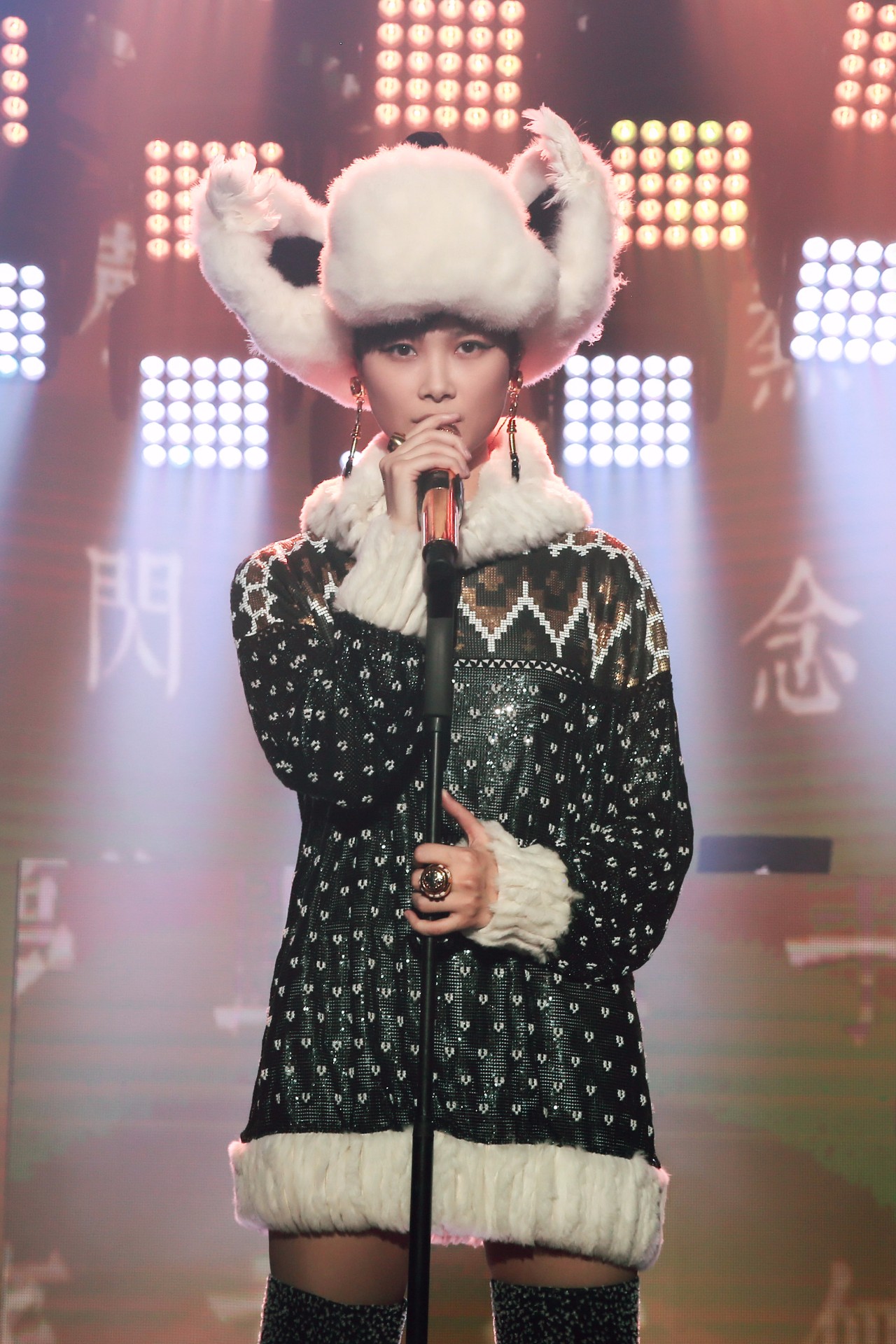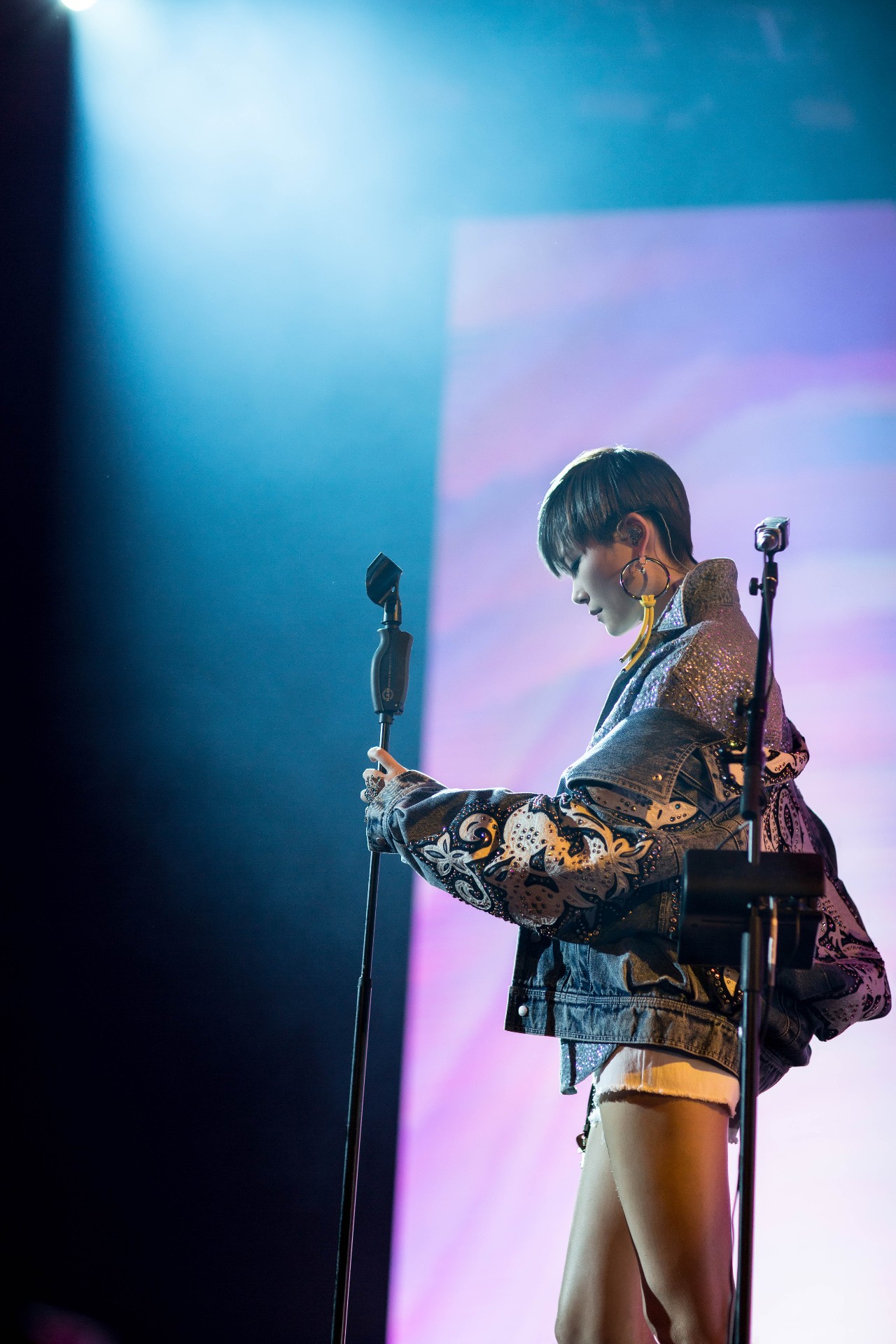 接着,她又创意运用双立麦,制造不同的人声效果唱起了专辑里最抒情的一首《耳机》,《年轻气盛》,则是在喊出“疯一疯闹一闹,温顺尚早”后用Floor tom为歌曲震撼收尾。