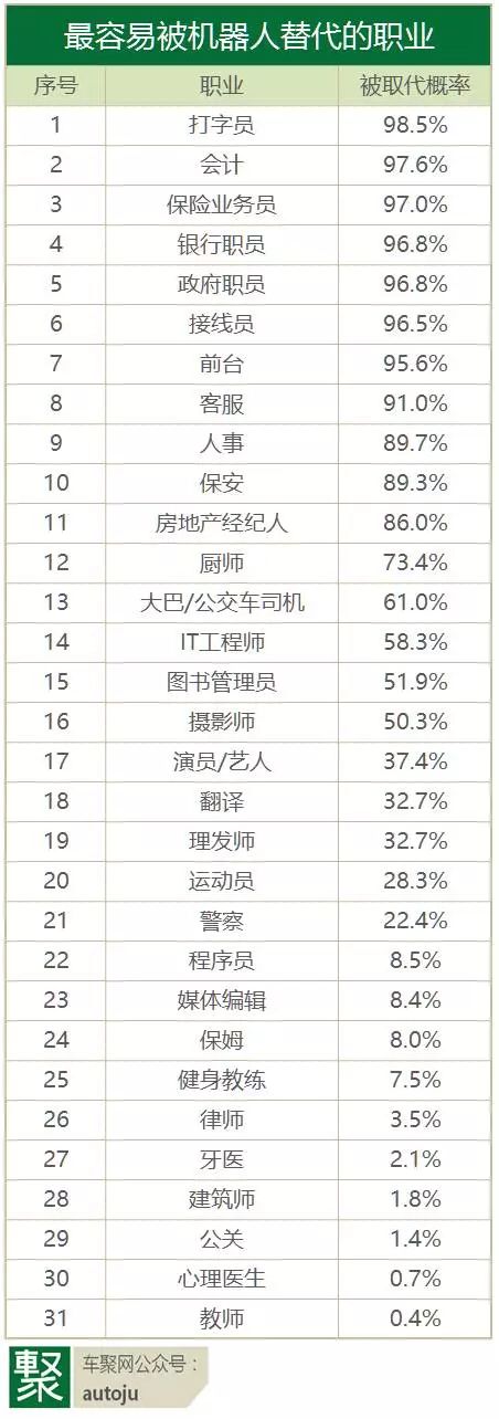 看到这里,你对阿尔法巴的诞生是兴奋还是恐惧?无论是什么态度,人工智能日后会逐渐替代部分人类工作。两年前,牛津大学马丁学院做了一个很有意思的研究,并提供了数据,看看谁的职业最容易被机器人替代。