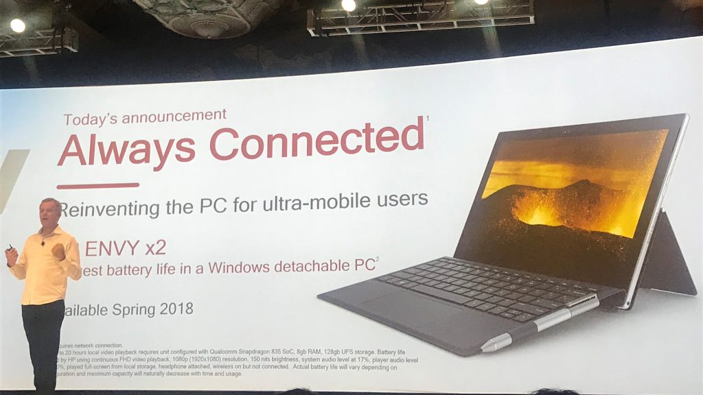 而为了呼应高通与微软合作,搭载 ARM 架构处理器的 Windows 10 的常时联网笔电的上市计划,品牌笔电大厂惠普(HP)与华硕(ASUS)也在论坛现场展出新款常时联网笔电产品。首先,惠普的 ENVY X2 常时联网笔电采用超薄可拆式设计,无风扇,铝镁合金的平板电脑机身厚度仅为 6.9mm,配备 12.3 寸 WUXGA 触控屏幕,搭载高通骁龙 Snapdragon 835 处理器,内建最高 8GB LPDDR4X 存储器及 256 GB SSD 储存硬盘。