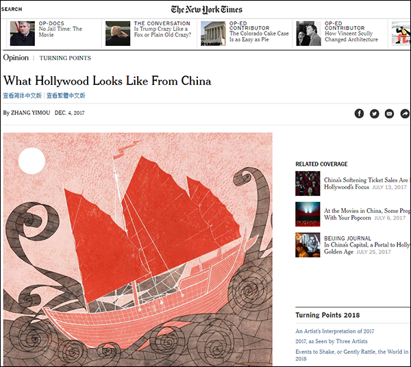 当地时间12月4日,美国《纽约时报》刊登了中国导演张艺谋的署名文章,题为“从中国看好莱坞,是什么样的?”(What Hollywood Looks Like From China)。