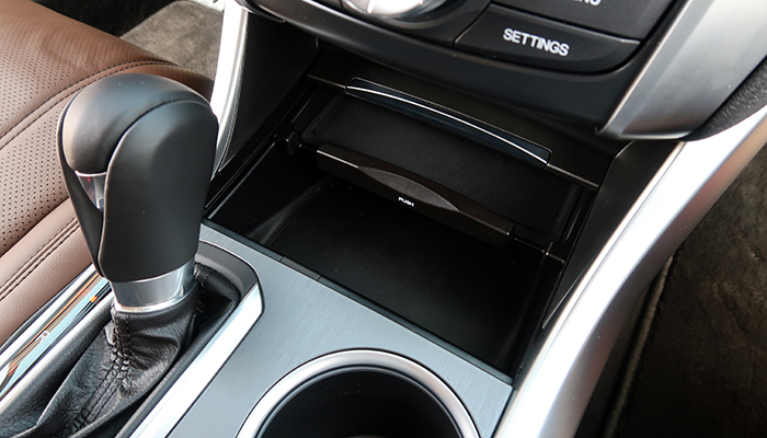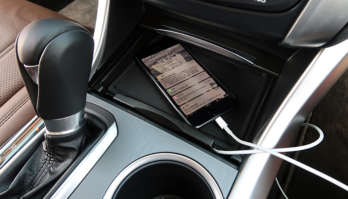 第二是挡把前方的两层储物格设置,一个12V的点烟器和一个1.0A的USB充电口从数量上说完全过关,专为充电线留出的空槽也充满着巧思。但这个两层储物格对大屏幕手机的友好程度有待提高,实测苹果7和8不带保护套能放入,一旦带上保护套就会显得空间不足(很明显讴歌在这点上还要再读懂国人一些,中国消费者有几个用手机不带保护套的?),而PLUS机型及更大的屏幕的手机(比如华为Mate9)就置入无能了,也没办法将手机放在光滑的储物格盖板上,这样在行驶过程中很容易造成手机来回滑动影响安全。