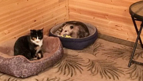 我也有个负鼠常客,她很温顺,我的猫也不介意她,我们都很开心。