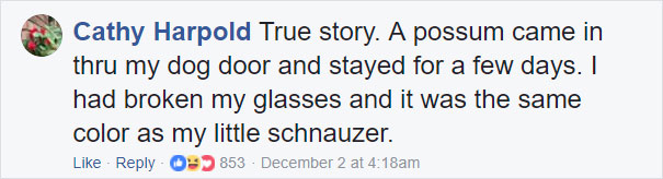 讲个真事,有只负鼠从我家狗走的小门进了我们家。那几天我眼镜正好坏了,它的颜色还跟我们家雪纳瑞一摸一样。