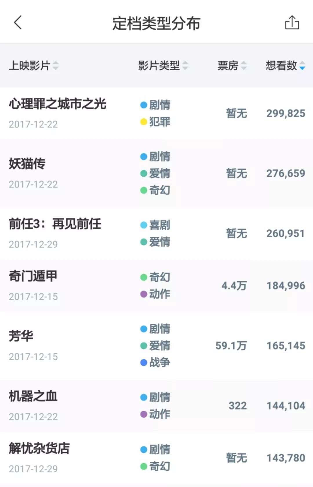 影片多样的题材给观众提供了更丰富的观影选择,但它们都不约而同地避开了元旦和春节两个节日。元旦有《前任3》、《解忧杂货店》、《二代妖精》、《妖铃铃》等,春节则分布的是《捉妖记2》、《西游记之女儿国》、《唐人街探案2》、《熊出没·变形记》等,都是爱情片或者喜剧片这样的“合家欢”题材,更加符合节日氛围。