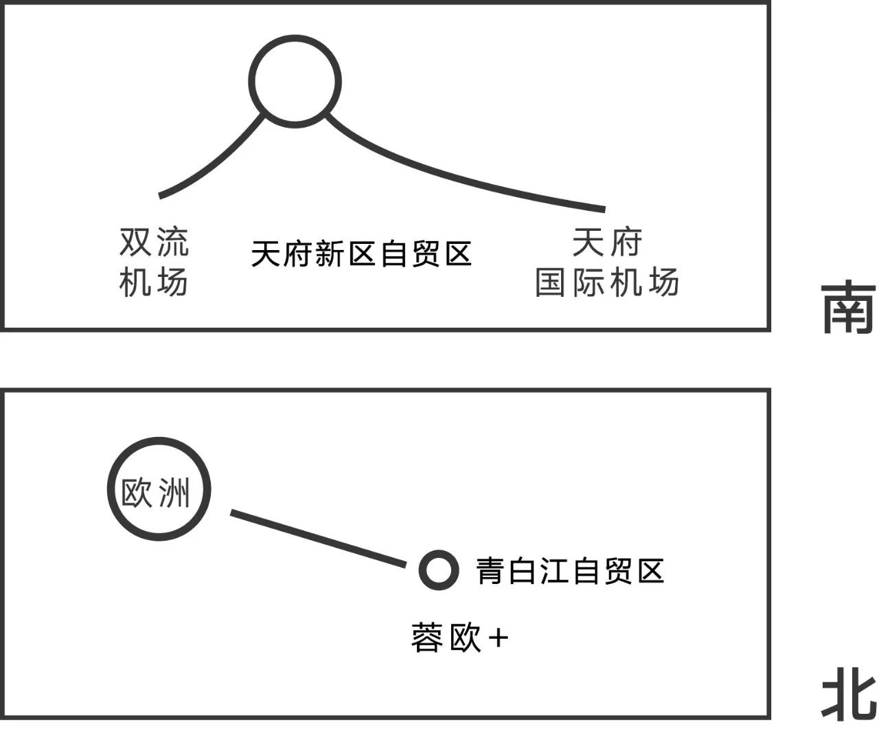 除了高附加值打法,北部新城还采取了城南擅长的国际化路线。两大区域,各自连接南北两大自贸区(天府新区自贸区、青白江自贸区),与国际同轨。在重叠之处,还布局了国际的重大项目,异常显眼。↓↓↓↓↓