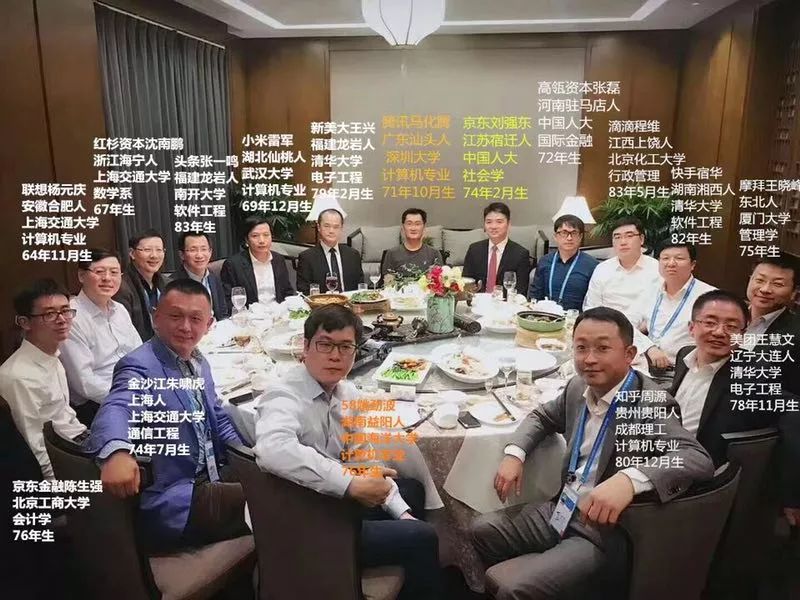 这个"朋友圏",以小马哥为首,顺时针数依次是——腾讯马化腾、京东刘强东、高瓴资本张磊、滴滴程维、快手宿华、摩拜王晓峰、美团王慧文、知乎周源、58姚劲波、金沙江朱啸虎、京东金融陈生强、联想杨元庆、红杉资本沈南鹏、今日头条张一鸣、小米雷军、美团王兴,共计16人。
