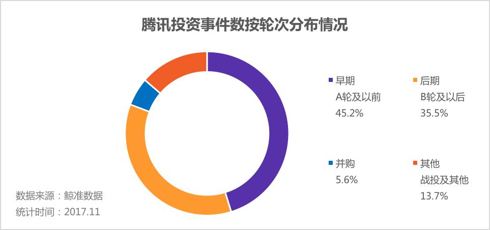 腾讯的投资偏好非常明显,要么赶早、要么抄底。过去7年的投资事件中,45.2%属于早期投资,其次是战投及其他。
