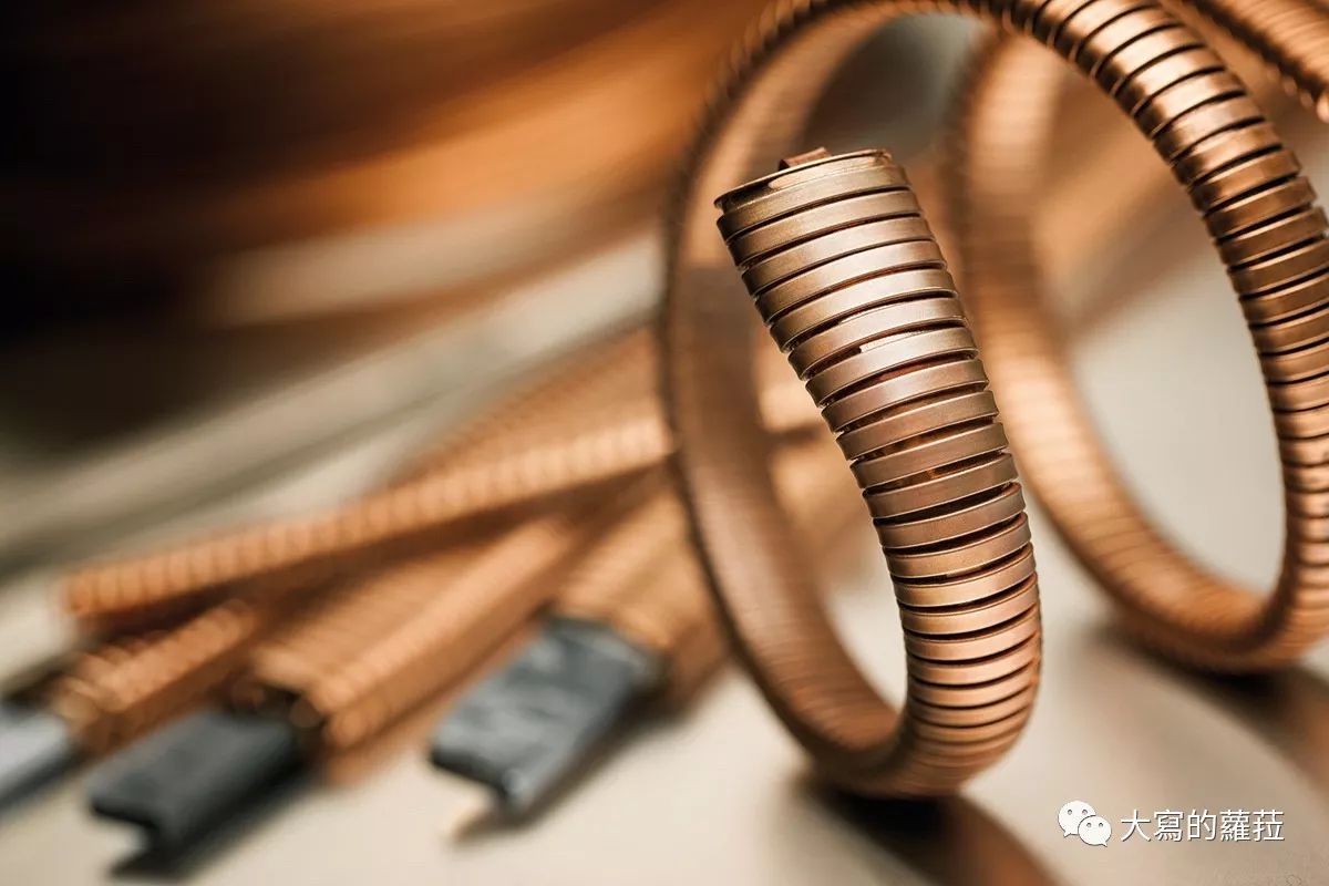 “Tubogas”虽说不是宝格丽的专属风格,却恰恰最为宝格丽发扬光大,这种工艺最常见于意大利的珠宝工匠工坊,近四十年来也只有宝格丽在“Tubogas”的工艺里,获得最大的创意成功以及标记性的地位奠定。而除了“Tubogas”这种缠绕金线工艺,制作出有弹性且方便任何佩戴的强烈风格外,宝格丽以上窄下宽的链扣,链结出弯曲的蛇形手环。这种如同珠宝制作方式一般:先使用蜡模铸成蛇型环的每一个环节(鳞片),并以贵金属打造这些精密计算后,大小不一却又各个精确吻合链结的环扣,再接续以手工方式一一组装,每一个组件经过精密的脚链结串连在手镯内部的贵金属弹簧,在所有链结环上之后,却依然可以轻松舒服的佩戴。