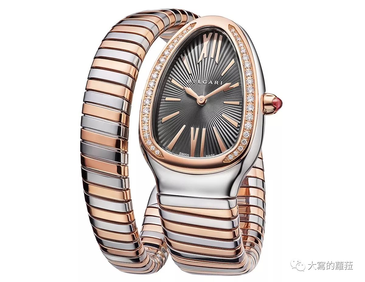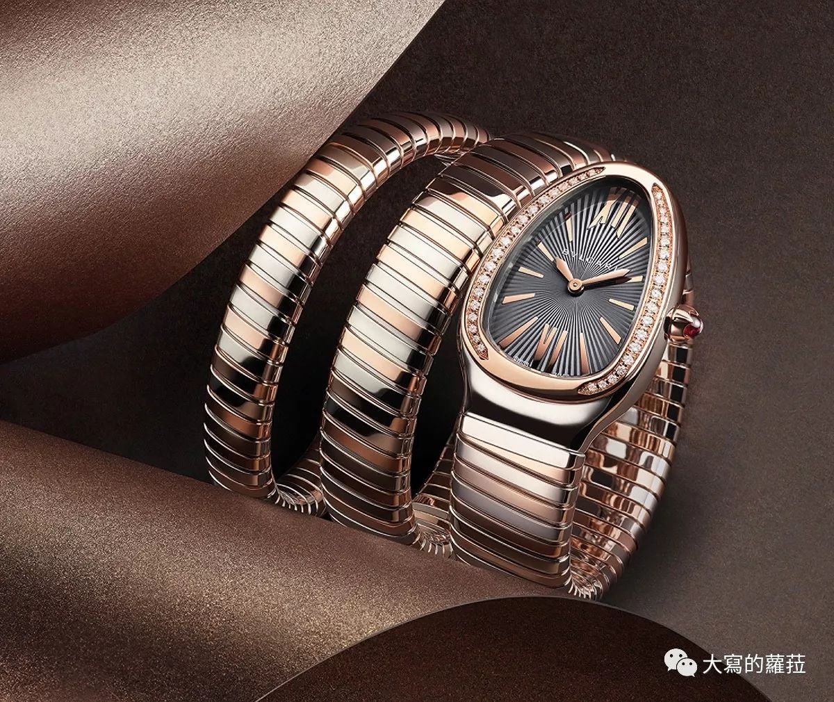 △宝格丽Serpenti Tubogas系列腕表以玫瑰金搭配不锈钢制成Tubogas链带。