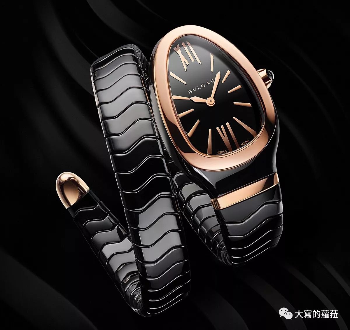 △宝格丽Serpenti Spiga系列腕表以陶瓷打造出如Tubogas缠绕手腕的链带。