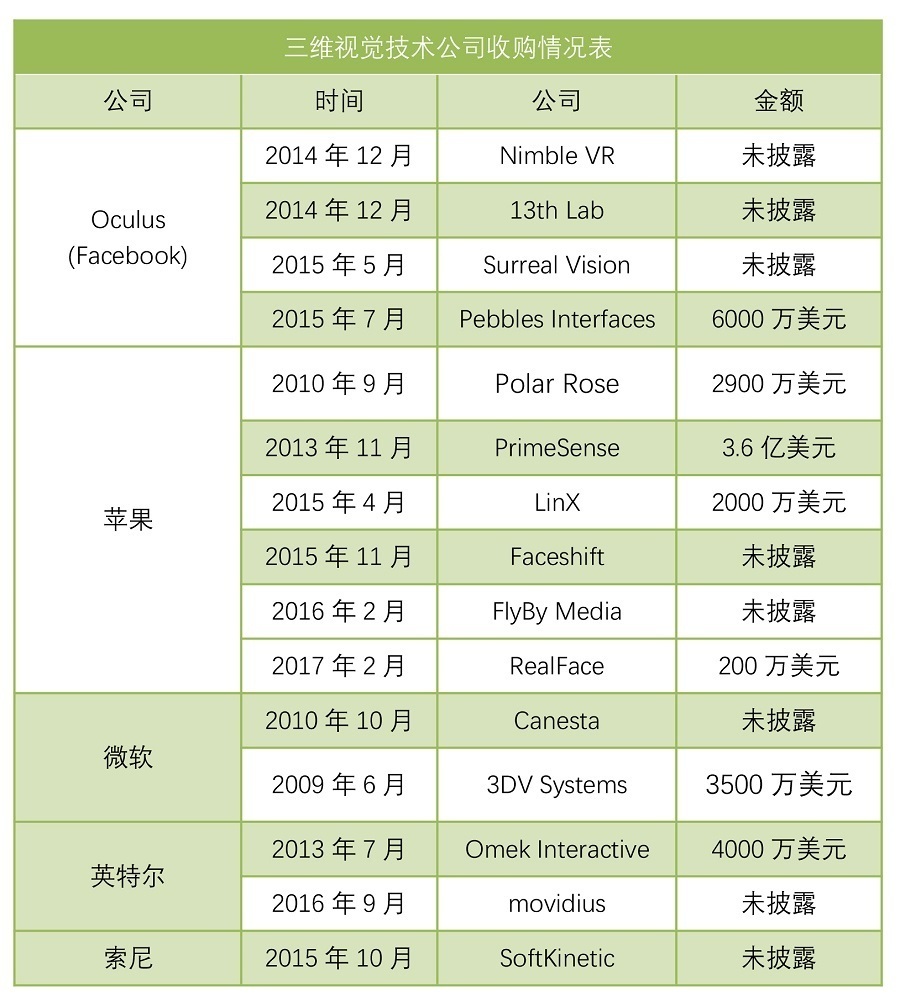 比如苹果在2013年花费3.6亿美元收购的PrimeSense,其前身是微软Kinect的技术提供商,被苹果收入麾下后,他们的结构光方案也就成功的运用到iPhone X上。