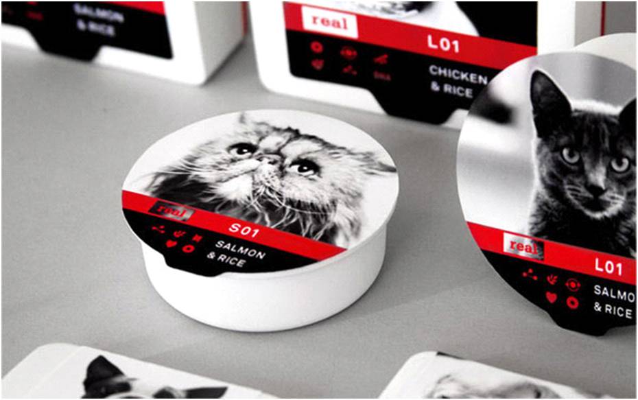 该款包装直接抛出主题——货真价实的食品,告诉主人们宠物们吃了哪些食材。简单的白盒,配以易开易拉的盖子,使每次喂食变得轻而易举。盖上的宠物黑白真实面貌,配以红黑色的材料描述,给人简单而稳重的感觉。