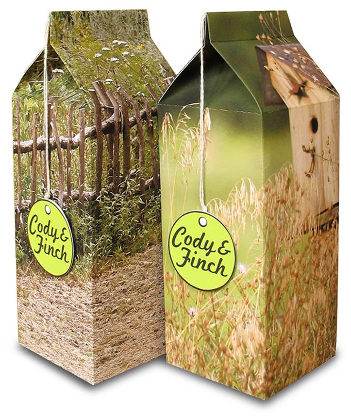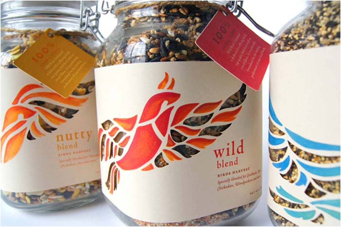 以可回收利用的玻璃罐为主要器皿,火鸟及水鸟的图案显示了喂食对象;透过图案翅膀一个个镂空的小窗,消费者可以看到新鲜的鸟儿食粮。有质感的材料配上唯美的图案,简约大方、富有灵气。