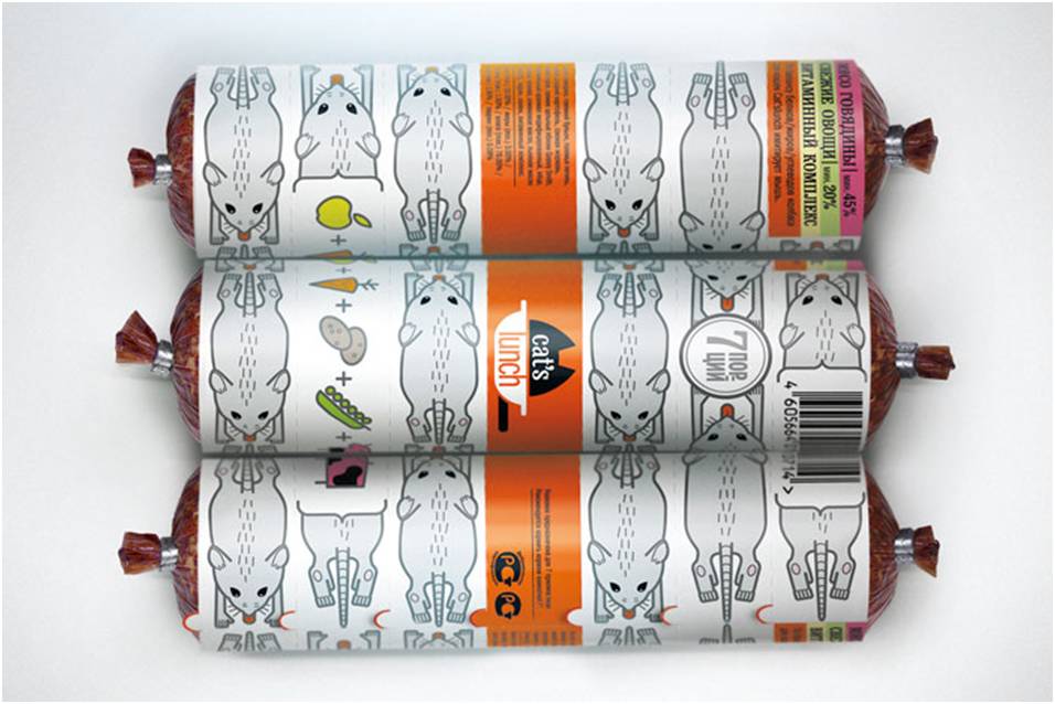 此作品在包装图案上的设计确实是别出心裁啊!明明是猫食,却在包装印上一只接一只的老鼠,需要消费者动动脑筋猜到答案。诙谐可爱的用意加上萌萌的卡通老鼠,让主人们眼前一亮。