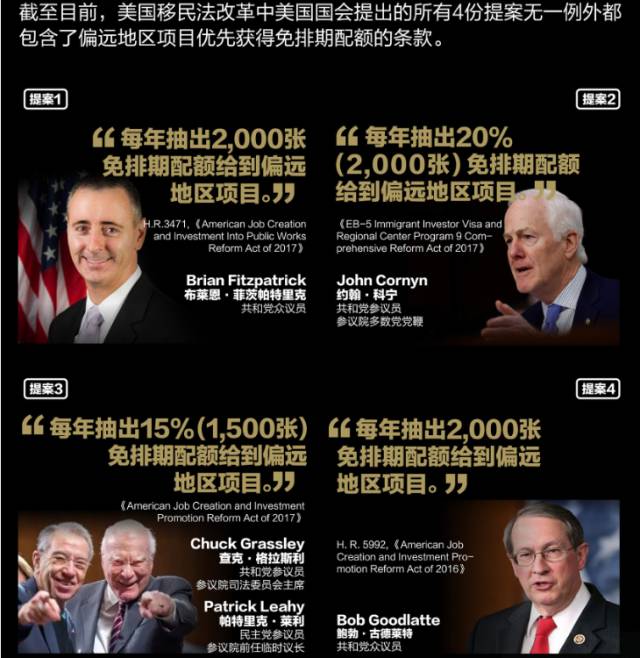 目前美国国会所有的投资移民法案改革的提案,无一例外都包含涨价条款、以及为偏远地区项目提供免排期专享配额的条款,这些项目的投资人可以免排期获得绿卡。
