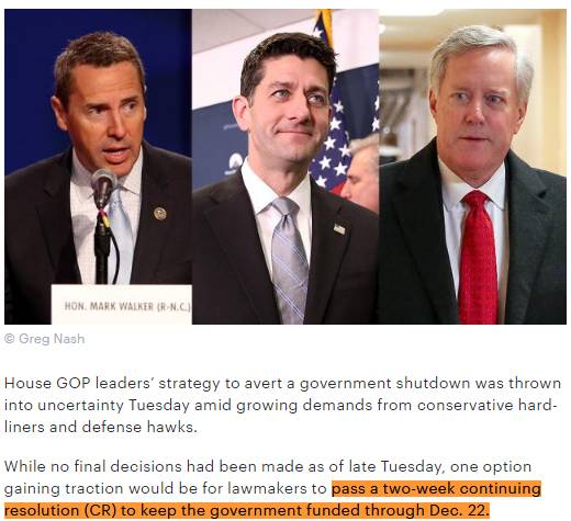 不久之前,美国国会刚刚通过了历史上最大的税改法案,两院对于税改还需要进行磋商妥协达成一个两院一致认可的版本。这将是接下来一周的国会重头戏。由此可见,现行预算案的顺延是势在必行的。