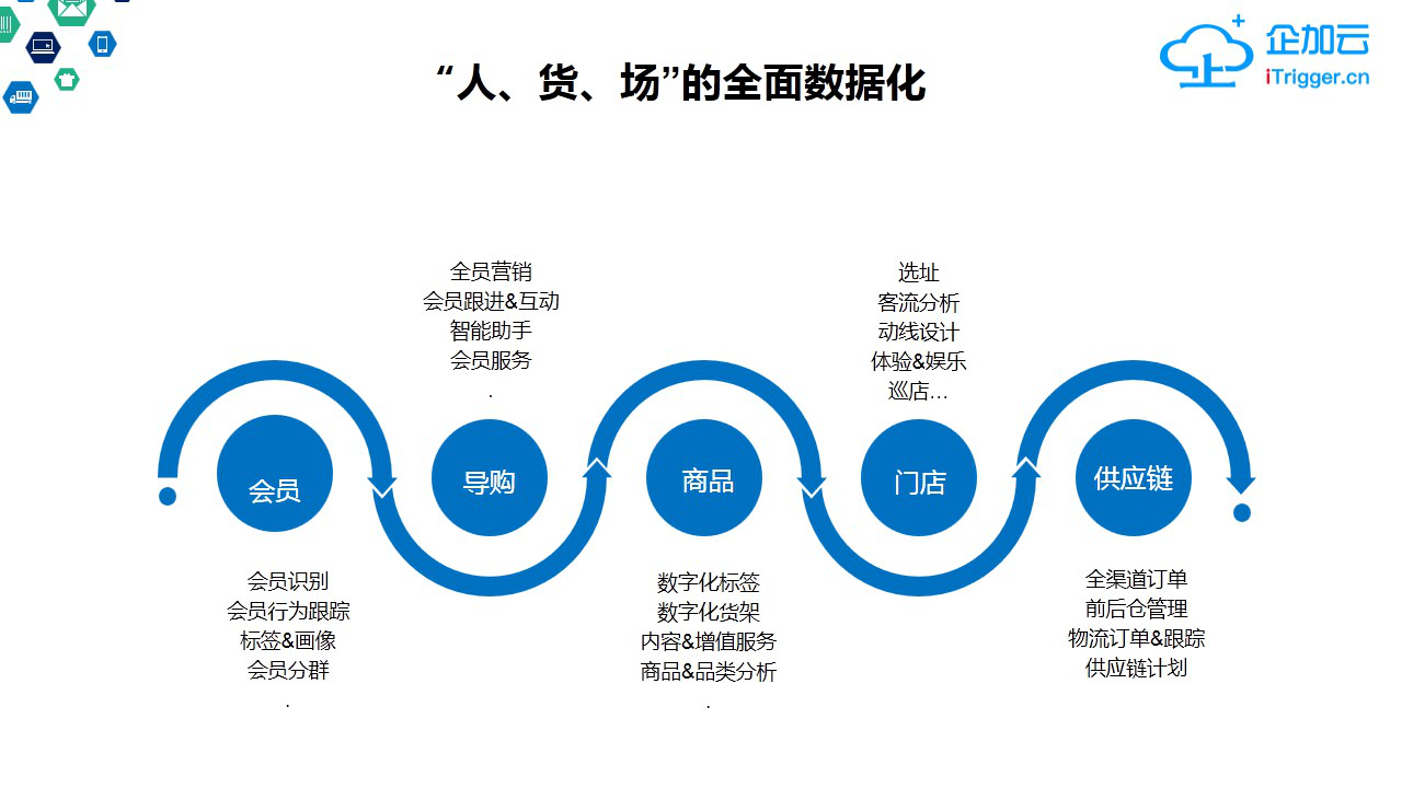 新零售服务系统不是“头痛医头、脚痛医脚”式销售工具,而是对企业及品牌商的前台(消费者、商品、场景)、中台(生产体系、供应链、市场、客服),后台(云、App端、网站、技术、算法)等进行全盘化改造。