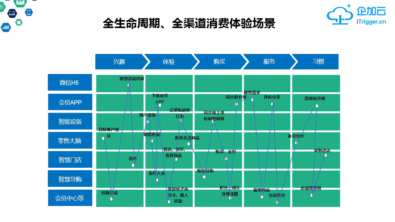 消费者画像体系是新零售会员营销的前提,有的新零售店是直接扫码或刷脸形式打通用户在淘宝ID的消费大数据,或是店内的AR大屏、体验游戏额、Beacon、WiFi、摄像头等,店外合作DMP平台等多种渠道收集用户及反馈用户数据。企加云在此基础上,还对客流进行精细化分析、引导,并根据用户不同生命周期设计不同的营销方案,从而提升用户复购效率;等于把战略咨询的活也干了,成为企业营销部、策划部“智慧管家”。