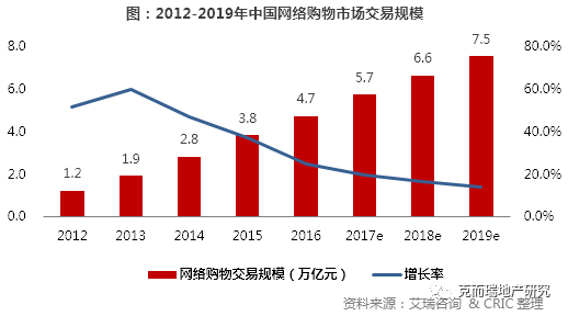 2012 年以来,电商市场交易规模一直保持高速增长,2011-2016年中国线上零售总额的复合增长率为44%,预计2019国内网络购物交易规模将达到7.5万亿。网络购物激增的配送需求成为优质物流设施市场的关键推动因素,将会是促使整个现代化物流地产行业扩张的主要生力军。