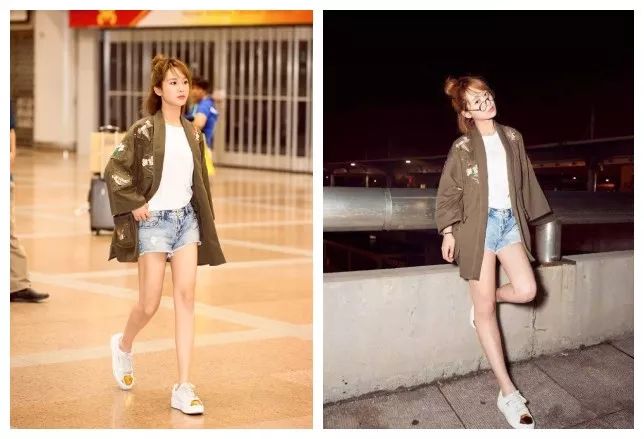 周冬雨的穿搭里面,最经常用到的技巧就是长+短,高腰短裤+中长款外套,不仅很好的掩盖上半身比较瘦的缺点,更显腿长。