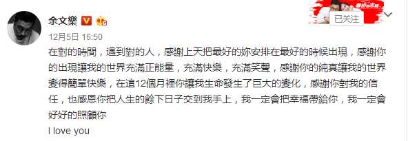 近日,六叔余文乐在微博和INS上公布了自己和女友的婚讯。