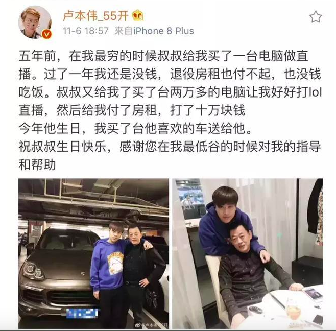 上月初,斗鱼一哥卢本伟为报答“岳父”五年前的知遇之恩,送了辆百万豪车保时捷给他,一时传为美谈,粉丝纷纷表示“卢本伟牛逼”,此时的卢本伟,正处在他主播生涯的顶点。
