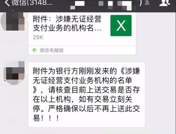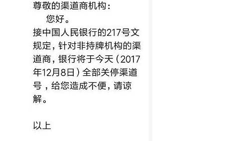 据有关信息显示目前多家银行已经下发通知对支付通道和商户进行整理整顿,部分银行已经关停支付通道,特别是聚合支付公司从银行对接的通道基本上将全部关停,直连微信或者支付宝的商户不受影响!据相关信息显示此前提供聚合支付交易通道几家主流银行民生银行,浦发,兴业,中信等占据主要银行端通道市场,拥有一定市场占有量,预测一大批机构和商户将被主动或被动关停,一场洗牌再次来临!