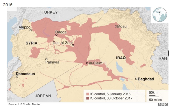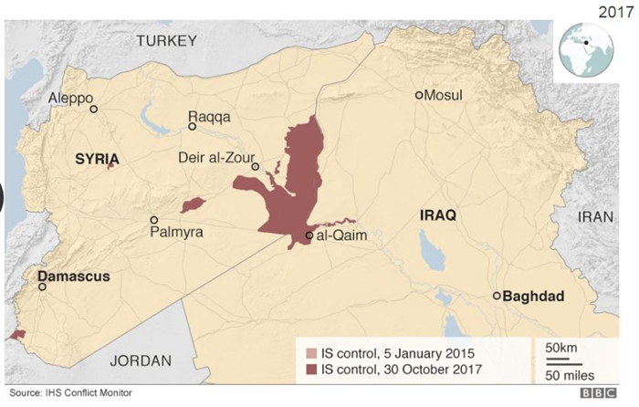 2017年7月,在进行了三年多的战争后,伊拉克政府宣布收复摩苏尔;11月,伊拉克政府宣布收复幼发拉底河谷小镇拉瓦,这也是ISIS在伊拉克的最后主要据点。