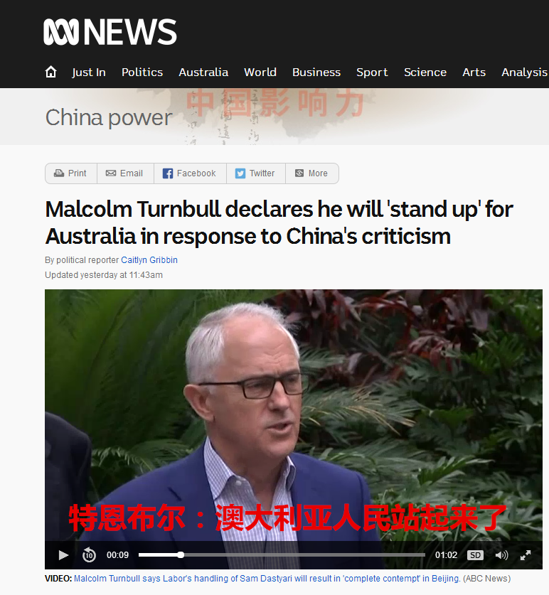 澳大利亚总理特恩布尔日前宣布将推行新的反间谍和外国干预法,又指责称“中国影响力正干预澳大利亚政治”,中国外交部发言人8日回应称,我们对澳大利亚领导人有关言论感到震惊,这种言论纯属捕风捉影、无中生有,毒化了中澳关系气氛,中方对此表示强烈不满,已向澳方提出严正交涉。随后特恩布尔周六(9日)回应了中方,并用普通话称“澳大利亚人民站起来了!”