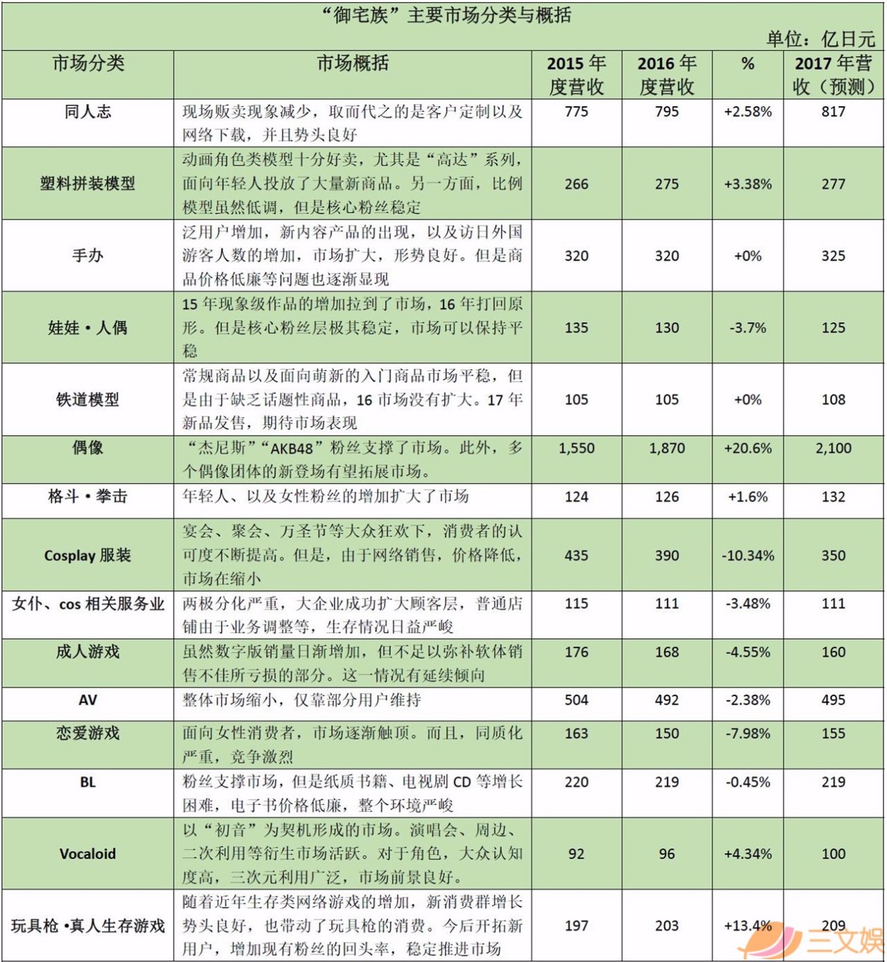 随着“御宅族”群体的经济影响力逐渐扩大,市场细分化愈发明显。矢野研究所将子市场归类为15个,分别进行了阐述。
