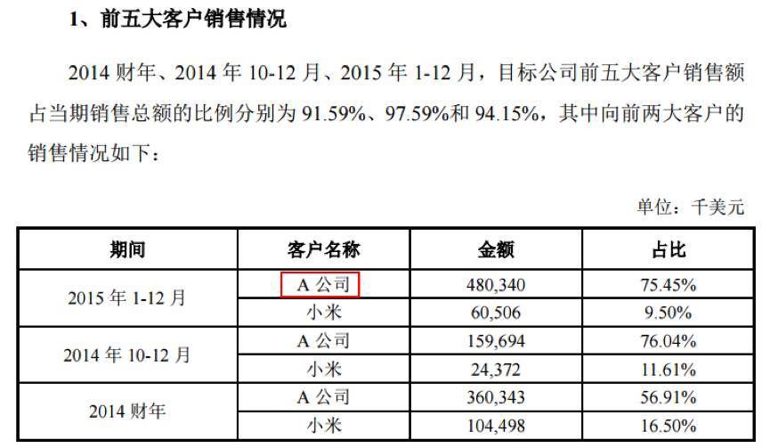 尽管已经被券商公认为苹果概念股,但是,在翻阅东山精密的公告时,发现了一个有趣的情况,就是东山精密2016年收购MFLX前后发出的披露公告中,关于MFLX的第一大客户仅用A公司来描述,但对于公司第二大客户则直接披露为小米。