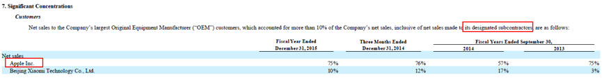 在2015年年报中,MFLX列出的第一大客户和第二大客户分别是苹果和小米,只是MFLX还额外强调了这部分销售是包括了对苹果及小米的指定次承包商的(原词为designated subcontractors)。