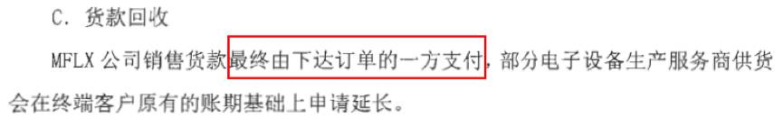 简单来讲,就是说MFLX一般是与包括苹果在内的OEM客户签订框架销售协议,但具体的订单一般是EMS厂商来直接下达,因此货款的结算一般也是与EMS厂商进行结算。