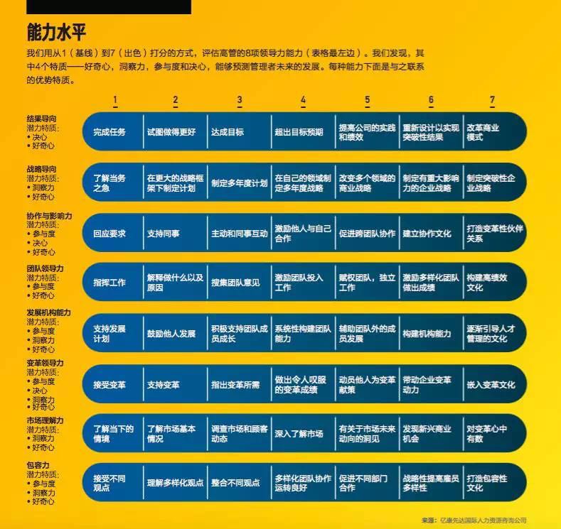 类似地,你所在的机构也应根据组织面临的挑战和目标,确定高管岗位所需的最关键能力。我们建议按照从1到7的评分方式,为各岗位每种能力的熟练程度打分。C级管理职位一般需要在关键能力项上至少得4分,CEO至少要5分。