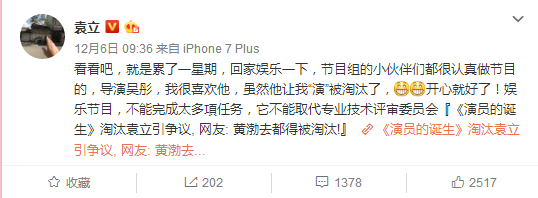12月6日,袁立在节目播出三天前发微博,爆料自己的淘汰是导演要求自己“演出来”的,暗示节目组存在黑幕。
