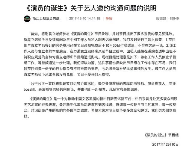 当天下午两点,《演员的诞生》官博发出声明,称聊天记录中提到的“确保晋级”等承诺是工作人员个人承诺,和袁立已于10月30日已经结清劳务。
