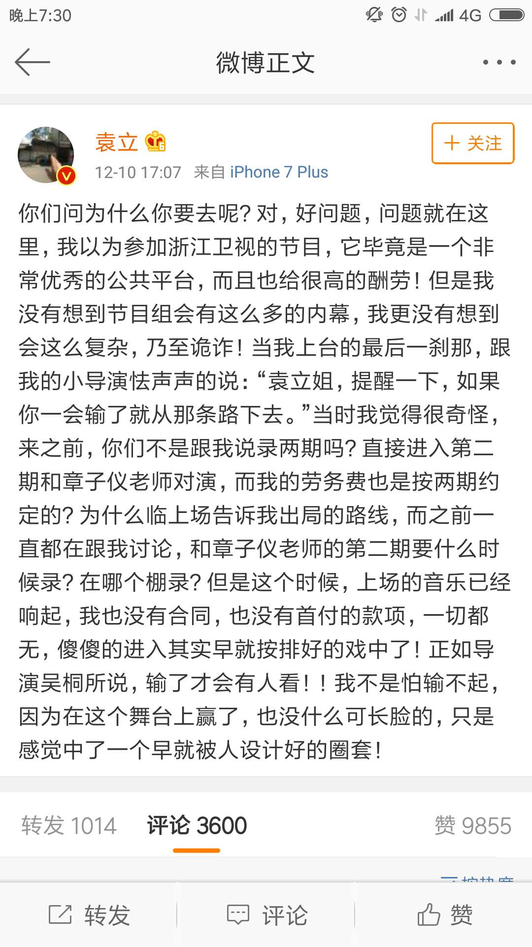 同天,截图中的节目编导发微博称,令袁立晋级是她的个人承诺,并表示自己已决定向频道提出离职申请,希望降低此事对袁立姐和频道的影响。