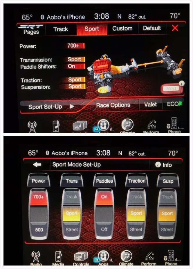 另外,虽然Hellcat版本的中控搭载的是FCA统一的Uconnect系统,但是这套系统相比于其他的Uconnect系统能显示更多关于车辆信息的内容,除了和仪表盘中央屏幕相重复的内容外,通过这块屏幕还可以选择马力输出的最大值,传动、悬架系统的工作模式等等,内容可以说是相当的全面。